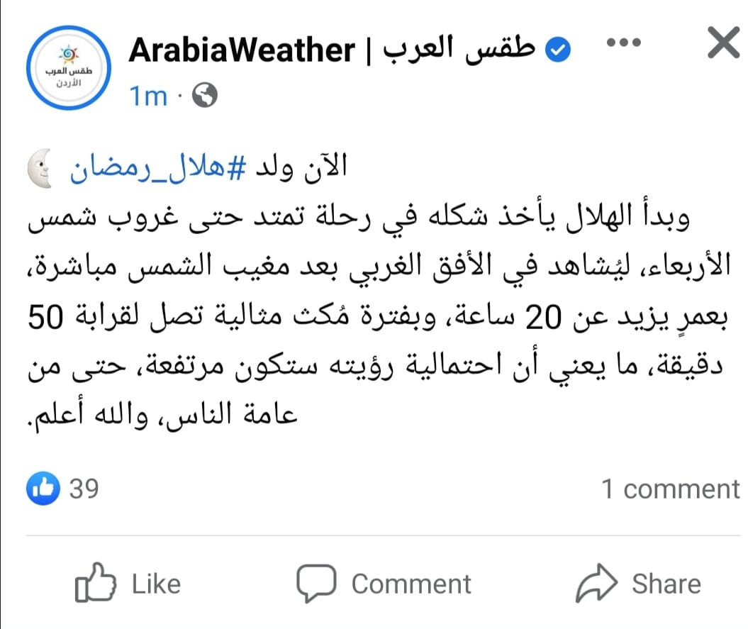 رم - قال موقع طقس العرب : الآن ولد هلال رمضان وبدأ الهلال يأخذ شكله في رحلة تمتد حتى غروب شمس الأربعاء، ليُشاهد في الأفق الغربي بعد مغيب الشمس مباشرة، بعمرٍ يزيد عن 20 ساعة، وبفترة مُكث مثالية تصل لقرابة 50 دقيقة، ما يعني أن احتمالية رؤيته ستكون مرتفعة، حتى من عامة الناس، والله أعلم.