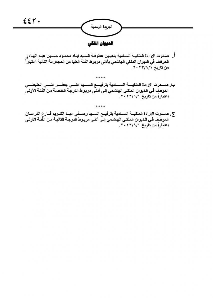 كما صدرت الإرادة الملكية السامية بترفيع علي جعفر علي الحنيطي الموظف في الديوان الملكي الهاشمي إلى أدنى مربوط الدرجة الخاصة من الفئة الأولى اعتبارًا من 1 أيلول.