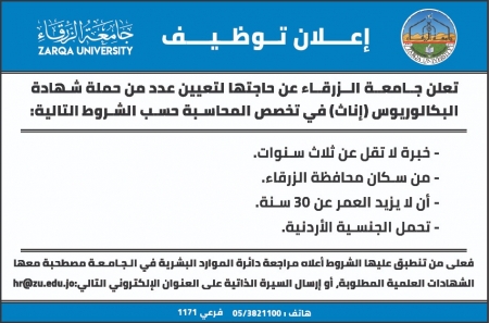 تعلن جــامعـة الــزرقـاء عن حاجتها لتعيين عدد من حملة شهادة البكالوريوس (إناث) في تخصص المحاسبة حسب الشروط التالية: