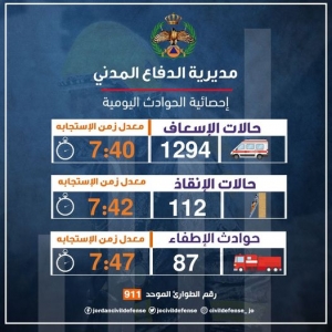 الراي نيوز  - تعاملت مديرية الدفاع المدني خلال الــ 24 ساعة الماضية مع (1294) حالة إسعافية مختلفة وبمعدل زمن الاستجابة (7:40) دقيقة.