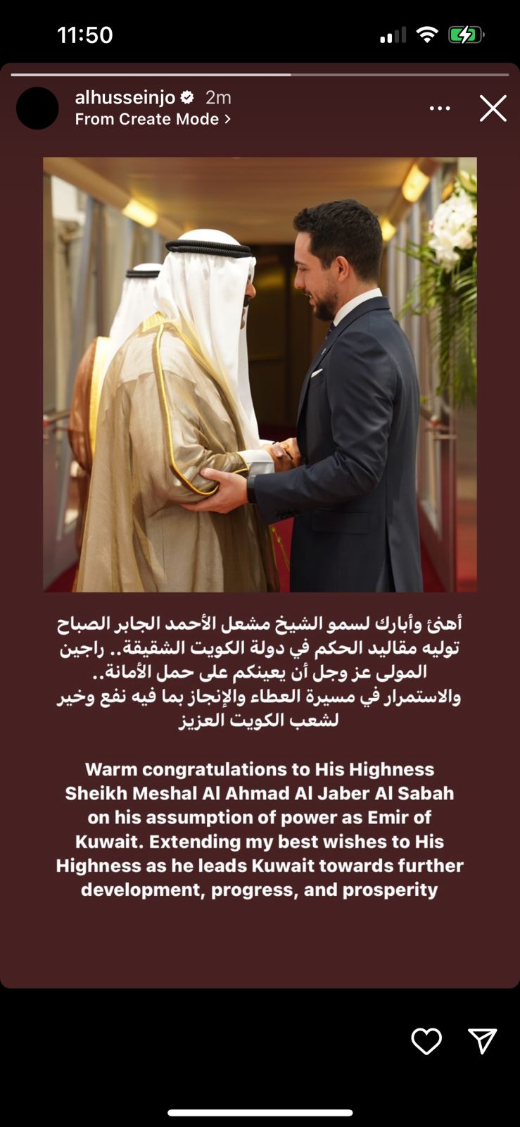 ونشر سموه على صفحته على إنستجرام " أهنئ وأبارك لسمو الشيخ مشعل الأحمد الجابر الصباح توليه مقاليد الحكم في دولة الكويت الشقيقة.. راجين المولى عز وجل أن يعينكم على حمل الأمانة... والاستمرار في مسيرة العطاء والإنجاز بما فيه نفع وخير لشعب الكويت العزيز."