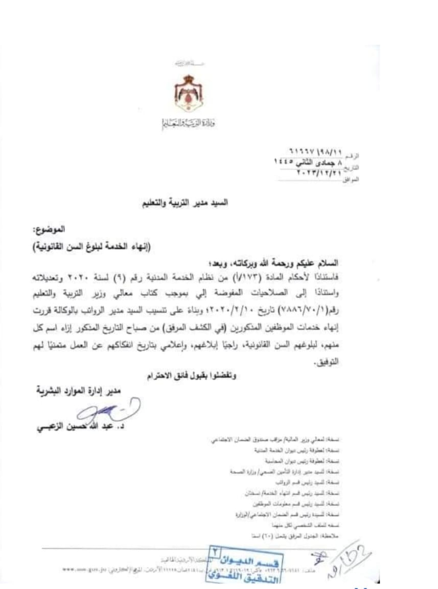 الراي نيوز - قرر وزير التربية والتعليم الدكتور عزمي محافظة انهاء خدمات 55 موظفا لبلوغهم السن القانوني للتقاعد.