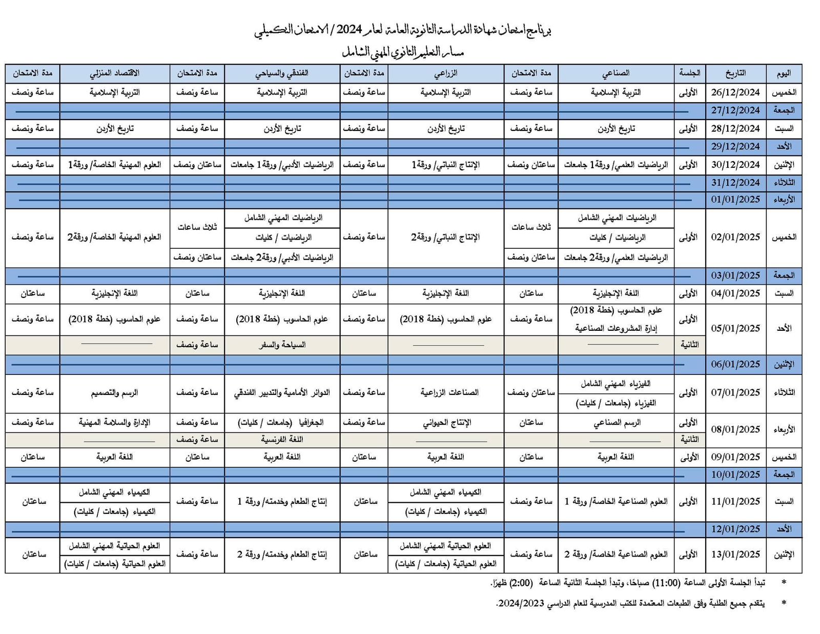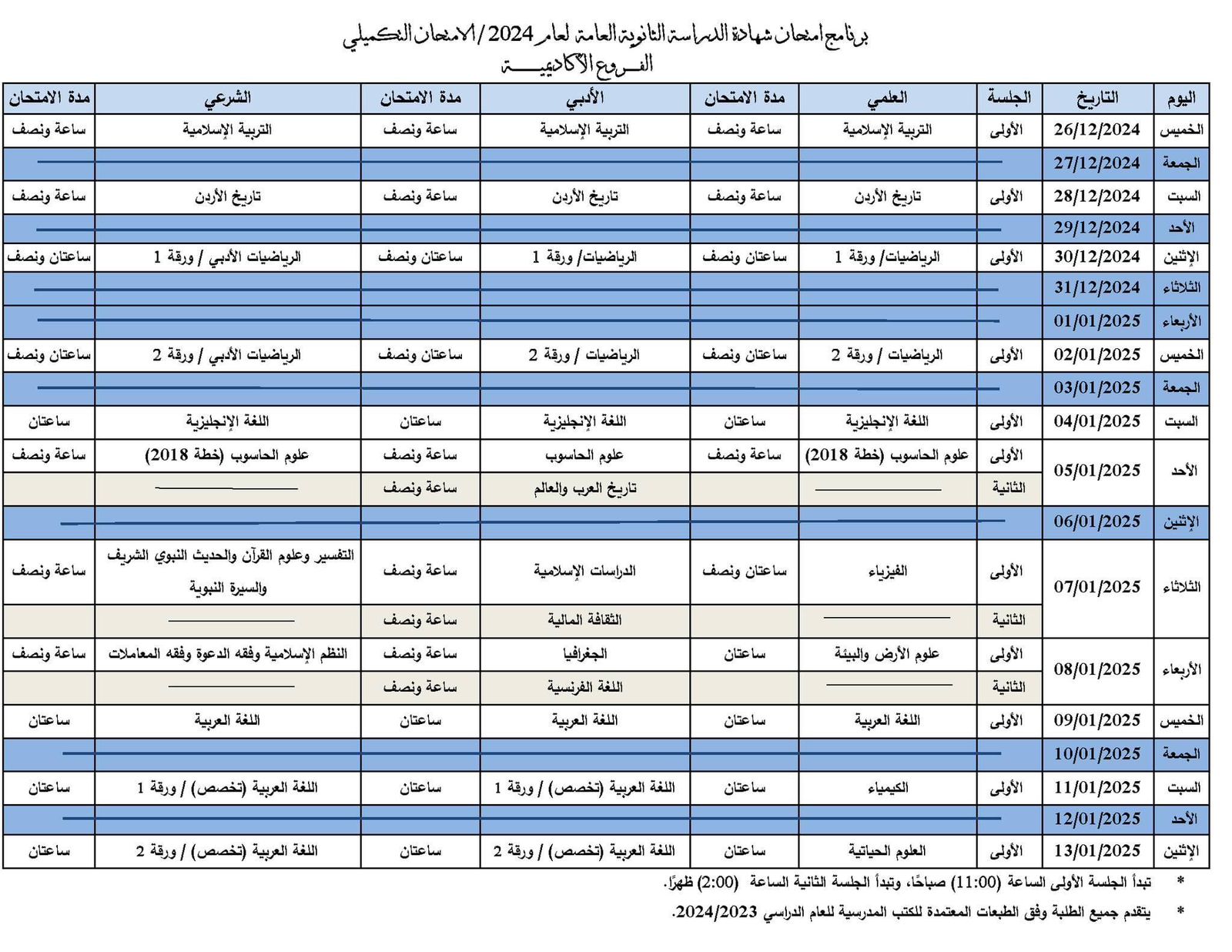 الراي نيوز -  أعلنت وزارة التربية والتعليم اليوم جدول امتحان شهادة الدراسة الثانوية العامة لعام 2024 / الامتحان التكميلي، وسيكون أول أيام الامتحان الخميس الموافق 26 كانون أول 2024.