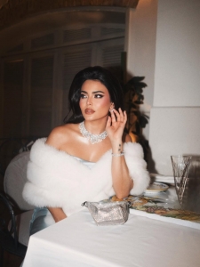 جمعت أسماء بإطلالتها في الحفل بين أناقة الفرو الأبيض على كتفيها ونعومة الساتان الأزرق بفستان سترابليس من تصميم #مرمر_حليم، والفخامة بمجوهرات ماسية مميزة من #شوبارد.