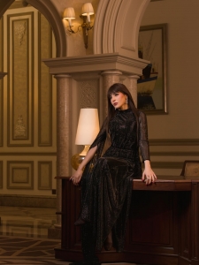ويحتل المخمل مكانة خاصة في خزانتها، فتختاره في الفساتين الداكنة كالعنابي والأسود على عكس الأقمشة الأخرى التي تختارها بألوان فاتحة وهادئة إلى جانب الأسود.