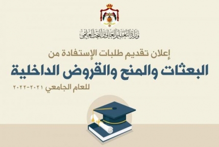 أعلنت مديرية البعثات في وزارة التعليم العالي والبحث العلمي للطلبة الأردنيين الملتحقين في الجامعات الأردنية الرسمية ضمن البرنامج العادي لمستوى درجتي البكالوريوس والدبلوم المتوسط عن بدء التقديم لطلبات الاستفادة من البعثات والمنح والقروض الداخلية للعام الجامعي 2021 / 2022، والتي يتم تنفيذها من خلال الوزارة اعتباراً من صباح يوم الإثنين الموافق 15 / 11 / 2021، وحتى الساعة الثانية عشرة ليلاً يوم الخميس الموافق 25 / 11 / 2021.