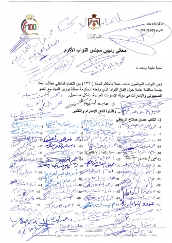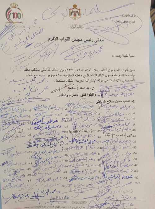 وجاء في المذكرة "نحن النواب الموقعين أدناه نطالب بجلسة مناقشة عامة حول اتفاق النوايا الذي وقعته الحكومة ممثلة بوزير المياه مع العدو الصهيوني والإمارات في دولة الإمارات بأمر مستعجل.