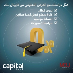تقدم جامعة الشرق الأوسط بالتعاون مع "كابيتال" بنك قرضًا تعليميًا تصل فترة سداده إلى 60 شهرًا، مع فترة سماحٍ تصل إلى 27 شهرًا لدرجة البكالوريوس، و3 أشهر لطلبة للدراسات العليا.