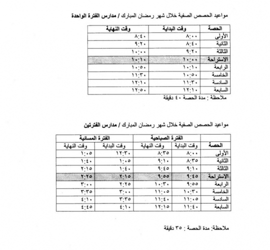 ووفق جدول الدوام تبدأ الحصة الاولى عند الساعة الثامنة صباحا في كافة المدارس، وتكون مدة الحصة الصفية في مدارس ذات الفترة الواحدة 40 دقيقة، فيما تكون مدة الحصة في مدارس الفترتين 35 دقيقة.