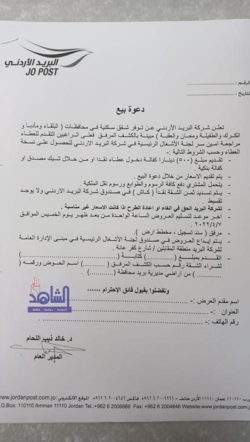مدير عام شركة البريد الاردني خالد اللحام و من خلال اتصال اجرته معه الشاهد ، اكد على تعاونه مع الراغبين من موظفي و متقاعدي الشركة في شراء و الشقق التي يسكونها المملوكة "للشركة " و بصفتها المسؤولة عن بيعها دون اخضاع هذه الشقق و المساكن للمزاد العلني ، وتمليكها لهم حسب سعرها المقدر من دائرة الاراضي ، بالطرق التي تتناسب مع اوضاعهم المالية ، من خلال اجراء مخاطبات رسمية مع بنوك في تسهيل معاملات المشترين .