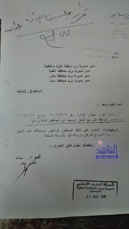و تابعو ... نناشد دولة رئيس الوزراء مرة أخرى بأن يتم بيع الشقق الغير مستعمله (المهجورة) وعددها (3) بالمزاد العلني حسب قرار دولة رئيس الوزراء رقم 14202 تاريخ 2/3/2016 والمعطوف على كتاب رئيس مجلس إدارة البريد الأردني رقم 1/41/2716 تاريخ 14/8/2018 والمرفق صوره عنه، وبيع الشقق المقطونه للعاملين والمتقاعدين القاطنين فيها حسب الأسعار التي تم بيعها للمؤسسات الحكومية الأخرى .