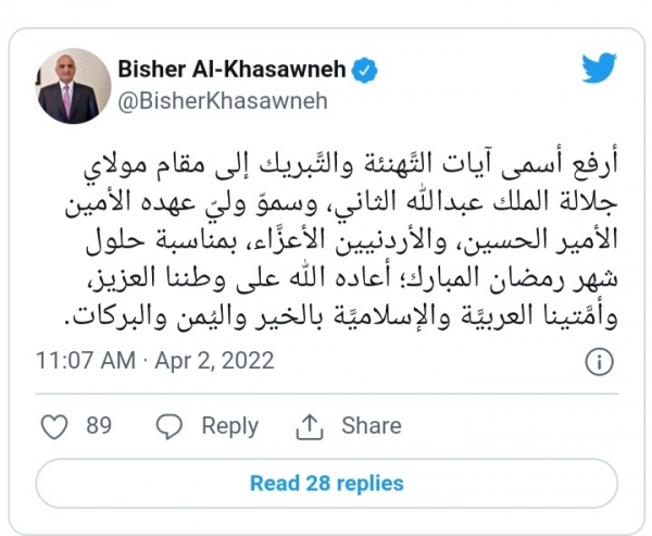وقال الخصاونة في منشور عبر "تويتر" اليوم السبت : " أرفع أسمى آيات التَّهنئة والتَّبريك إلى مقام مولاي جلالة الملك عبدالله الثاني، وسموّ وليّ عهده الأمين الأمير الحسين، والأردنيين الأعزَّاء، بمناسبة حلول شهر رمضان المبارك؛ أعاده الله على وطننا العزيز، وأمَّتينا العربيَّة والإسلاميَّة بالخير واليُمن والبركات".