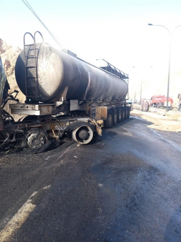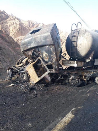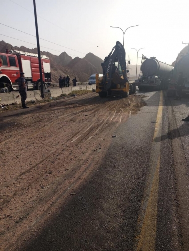 وقالت الوزارة في بيان صحفي صادر عن وحدة الإعلام والاتصال، إن كوادر مديرية اشغال العقبة العاملة في الميدان تتعامل بالتعاون مع الشركاء في مديرية الامن العام في تمام الساعة الخامسة مساء مع حادث تصادم 3 صهاريج محملة بحامض الفسفوريك نتج عنه احتراق احداها، حيث قامت الكوادر باغلاق كلي للطريق لحين الانتهاء من ازالة العوائق.