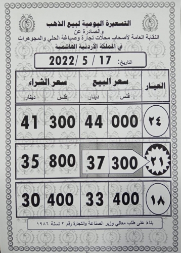 كما بلغ سعر بيع الغرام الواحد من الذهب عياري 24 و18 لغايات الشراء من محلات الصاغة 44 دينارًا و33.40 دينارا على التوالي.