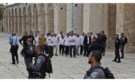 وقال مدير عام دائرة الأوقاف الاسلامية العامة وشؤون المسجد الاقصى في القدس الشيخ عزام الخطيب لمراسل (بترا) في رام الله، ان عشرات المستوطنين، اقتحموا ساحات المسجد الأقصى، بحماية جيش الاحتلال الإسرائيلي من جهة باب المغاربة، حيث أدوا طقوسا تلمودية استفزازية وقاموا بجولات مشبوهة في باحات الحرم القدسي الشريف فيما تصدى لهم بالطرد وهتافات التكبير الاحتجاجية حراس الأقصى والمصلون والمرابطون.