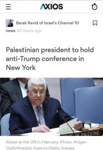 - نقل موقع اكسيوس الاميركي عن مصادر اسرائيلية واوروبية ان الرئيس الفلسطيني محمود عباس سعقد اجتماعاً مع ممثلين رفيعي المستوى من اربعين دولة ومنظمة دولية في فندق جراند حياة في نيويورك؛ بهدف حشد التأثير على خطة السلام المقترحة من الرئيس الأميركي دونالد ترامب والمسماة بصفقة القرن.