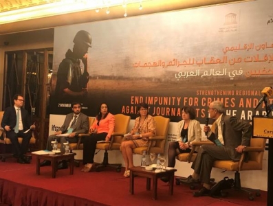 كما تحدّث شكشوك عن المبادرات التي قامت بها منظمة اليونسكو للحدّ من الإفلات من العقاب للجرائم المرتكبة ضد الصحفيين في العالم العربي و لتغيير الوضع على الأرض بالنسبة للصحفيين: "في المنطقة العربية، عملت اليونسكو منذ عام 2015 في الأردن مع محامين وصحفيين لتعزيز المهارات القانونية المهنية في دعم القضايا المتعلقة بالإعلام. كما دعمت المنظمة آلية داخل نقابة الصحفيين التونسيين لمراقبة الهجمات ضد الصحفيين. في لبنان, أطلقت اليونسكو العام الماضي مع الاتحاد الدولي للصحفيين وبالتعاون مع مديرية التعليم العالي مقرر نموذجي حول سلامة الصحفيين موجهة لطلاب الصحافة ومكيفة مع المنطقة العربية. وقد تم اعتماد هذا المنهج الجديد من قبل العديد من الجامعات في لبنان وفلسطين والجمهورية العربية السورية وسيتم توسيعه ليشمل في المستقبل جامعات أخرى تدرّس الصحافة. منذ عام 2017، عملت اليونسكو وشركاؤها مع وكالات إنفاذ القانون في فلسطين لتوفير دورات تدريبية تسلّط الضوء على أهمية إقامة علاقات مهنية مع الصحفيين وضمان سلامتهم. "