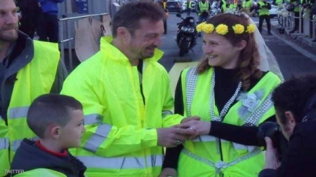 وقال موقع "إر تي إل" الفرنسي إن احتجاجات أصحاب السترات الصفراء في بلدية تارب الفرنسية، السبت الماضي، شهدت زواج عشيقين أمام المحتجين، الذين فاق عددهم 200.