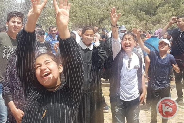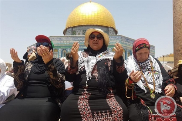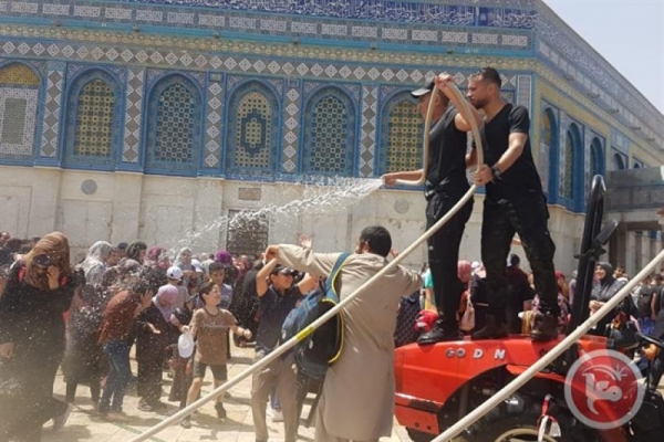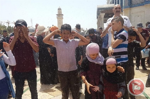 واكتظت المنطقة الشجرية والمظلات بالالاف المصلين بسبب ارتفاع درجات الحرارة، فيما قام متطوعون برش المياه على المصلين في الاقصى.