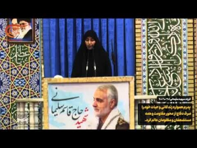 زينب سليماني ابنة قائد قوّة القدس الشهيد الفريق قاسم سليماني تشكر المقاومين في كلّ العالم الإسلامي وتؤكّد أنّ دماء والدها ستكون طريق العبور نحو القدس.