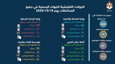 فيما قامت كوادر أمانة عمان بزيارة 215 منشأة خالفت 40 منها و4 مواطنين، بينما زارت فرق المؤسسة العامة للغذاء والدواء 185 منشأة أغلقت 8 منها وخالفت 89 أخرى.