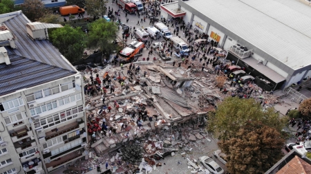 وبلغت قوة الزلزال 7 درجات، ودمر مبان في مدينة أزمير الساحلية. وأفادت هيئة المسح الجيولوجي الأميركية، أنه تم تسجيل الزلزال على بعد 14 كلم قبالة بلدة نيون كارلوفاسيون على جزيرة ساموس في بحر إيجه.