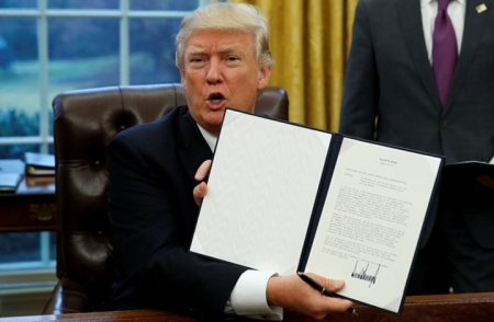 27 كانون الثاني/ يناير 2017: في غضون أسبوع من توليه الرئاسة، وقع ترامب على أمر تنفيذي يحظر دخول اللاجئين السوريين، ويمنع مواطني سبع دول ذات أغلبية مسلمة من دخول الولايات المتحدة لمدة 90 يوما.