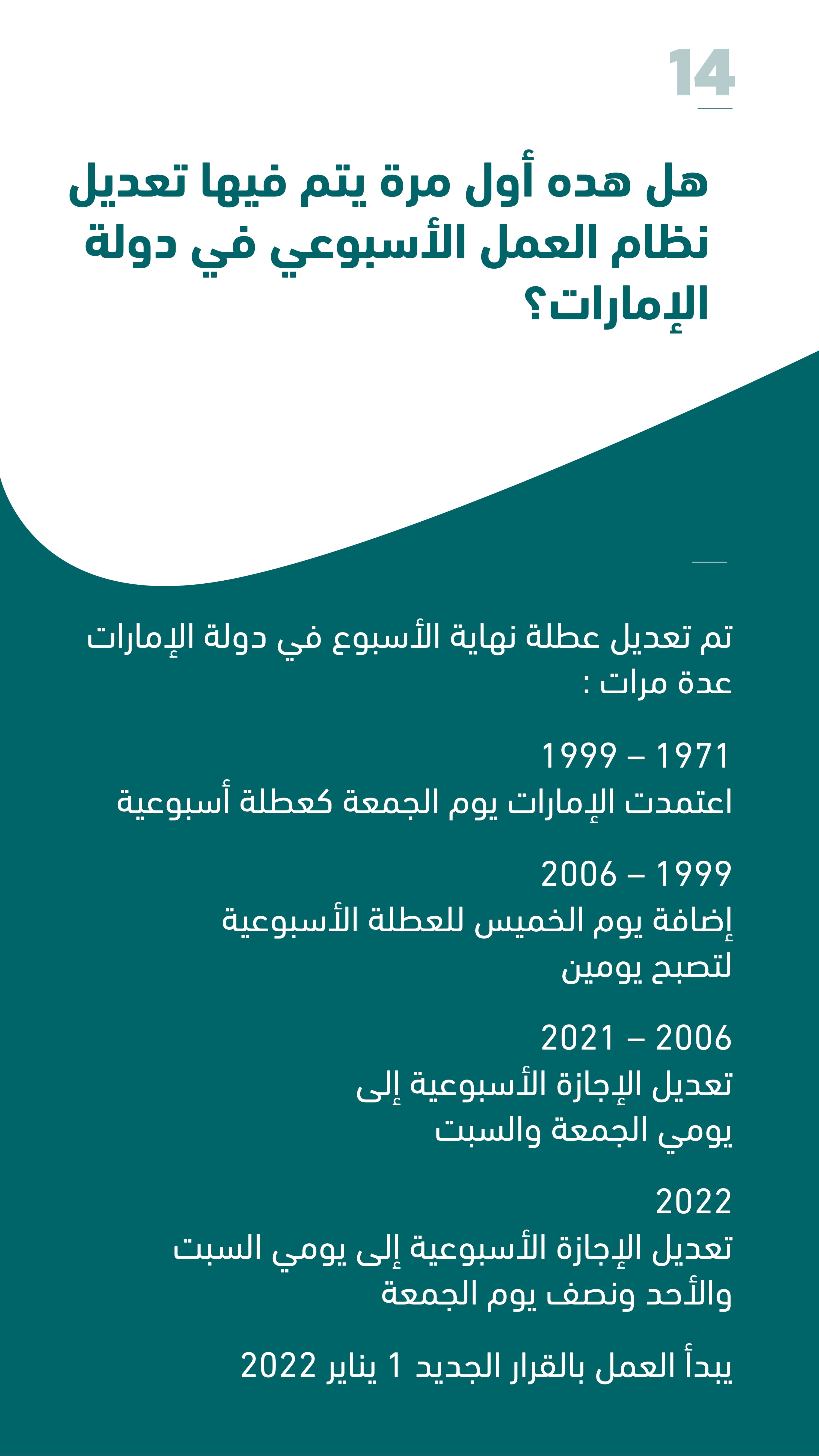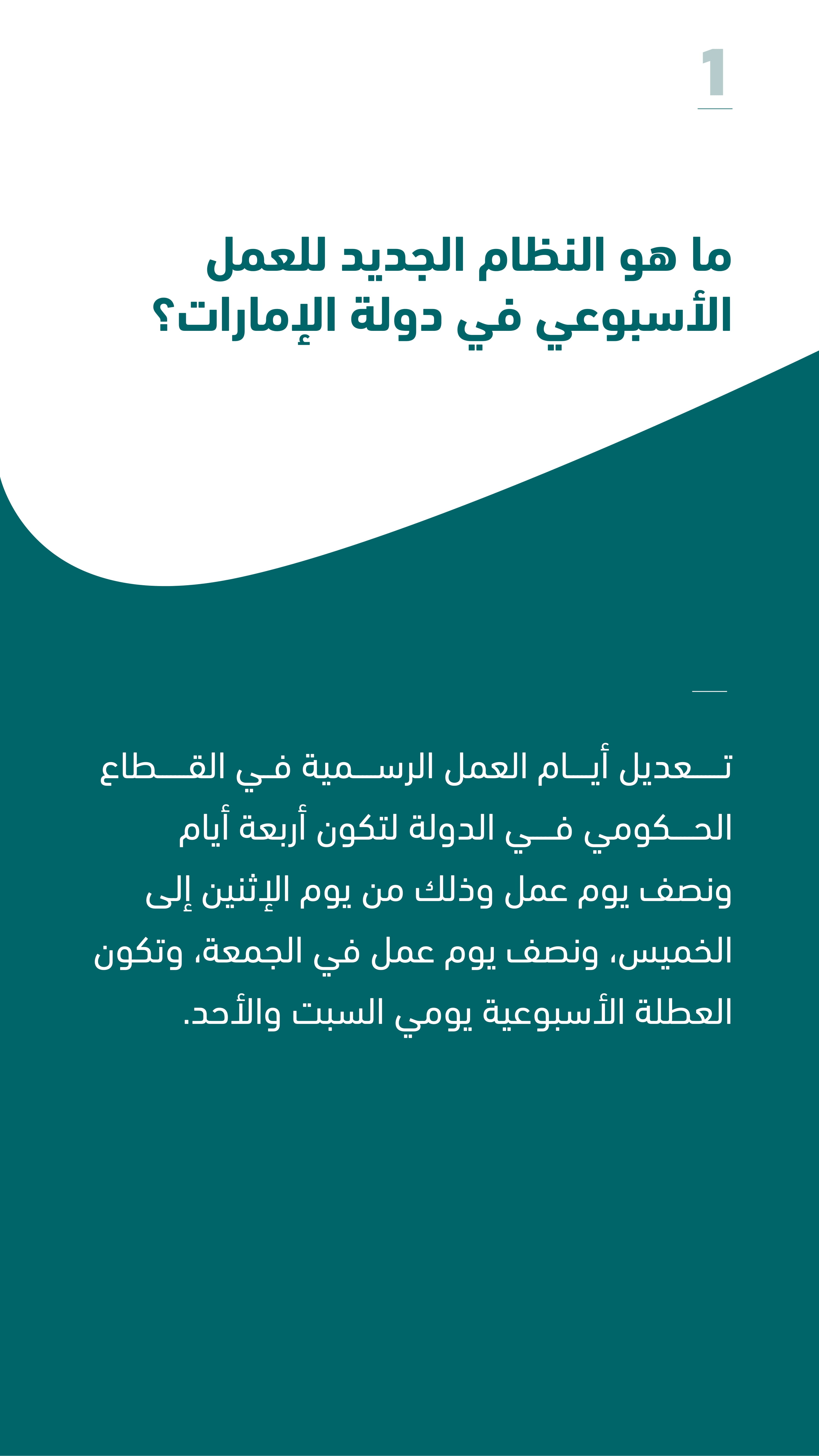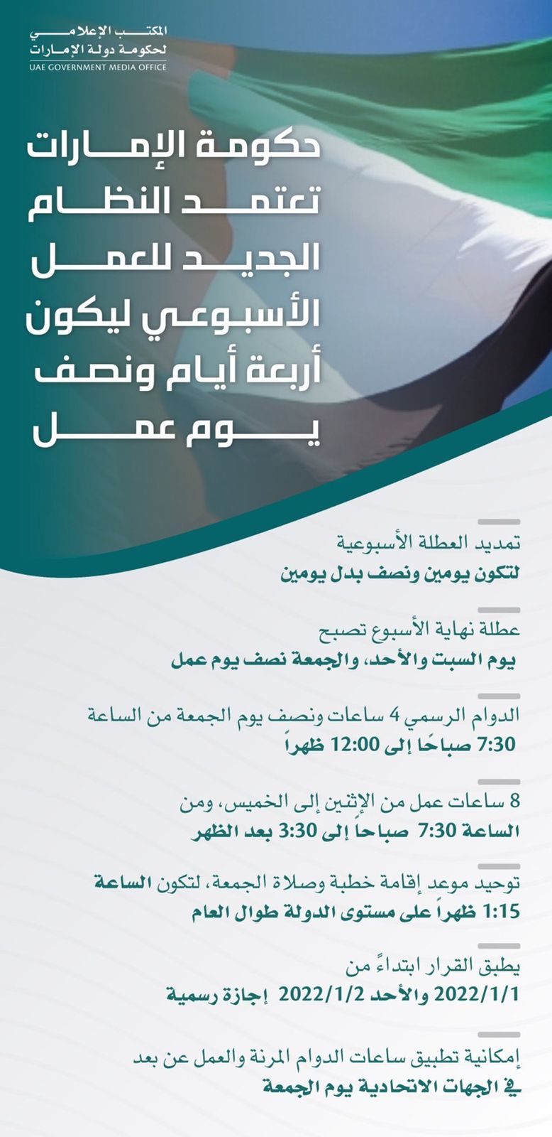 اعتمدت حكومة الإمارات، الثلاثاء، النظام الجديد للعمل الأسبوعي ليكون أربعة أيام ونصف يوم عمل أسبوعياً، والعطلة يومي السبت والأحد، والجمعة نصف يوم عمل إلى 12 ظهراً.