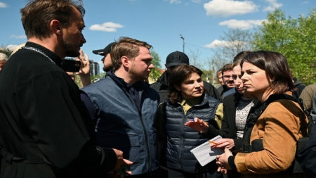 الرأي نيوز - زارت وزيرة الخارجية الألمانية أنالينا بيربوك ونظيرها الهولندي فوبكي هويكسترا ضواحي كييف حيث تتهم القوات الروسية بارتكاب فظائع، ضمن زيارة مفاجئة إلى أوكرانيا الثلاثاء.