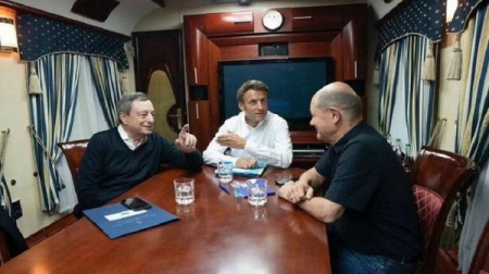 الرأي نيوز - استقل الرئيس الفرنسي إيمانويل ماكرون والمستشار الألماني أولاف شولتس ورئيس الوزراء الإيطالي ماريو دراغي ، اليوم الخميس، قطارا خاصا متوجهين إلى كييف، حسبما ذكرت وسائل إعلام إيطالية وألمانية.