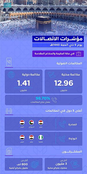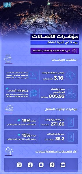الرأي نيوز - كشفت هيئة الاتصالات وتقنية المعلومات السعودية السبت، عن أداء شبكات الاتصالات في مكة المكرمة لليوم التاسع من ذي الحجة 1443هــ، حيث بلغ حجم استهلاك البيانات 3.16 آلاف تيرابايت، بما يعادل مشاهدة 1.29 مليون ساعة من المقاطع المرئية بدقة 1080p HD.