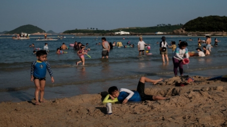 ودفعت الحرارة المرتفعة بمئات الأشخاص إلى الشاطئ في مدينة شيامن في فوجيان الأحد، بينما اختبأ آخرون من أشعة الشمس تحت القبعات وخلف أغطية الوجه.