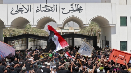 والثلاثاء، توجّه المئات من مناصري التيار الصدري إلى أمام مبنى مجلس القضاء الأعلى، معلنين البدء باعتصام "حتى تحقيق" لائحة مطالب أبرزها "حلّ البرلمان"، وفق بيان لإعلام التيار الصدري.