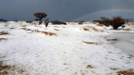 تساقط البرد على مناطق في جنوب الكويت الثلاثاء، في ظاهرة نادرة قال خبراء أرصاد جوية إن الدولة المعروفة بدرجات الحرارة المرتفعة لم تشهدها منذ نحو عقدين
