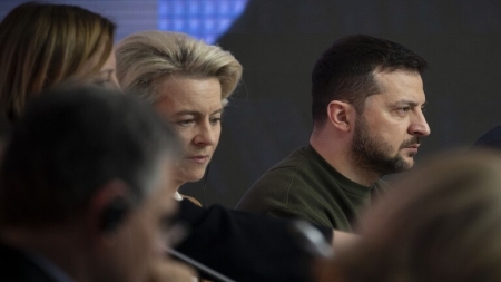 وبالإضافة إلى زيلينسكي، شارك رئيس المجلس الأوروبي شارل ميشيل ورئيسة المفوضية الأوروبية أورسولا فون دير لاين في المؤتمر الصحفي الذي أعقب الاجتماع