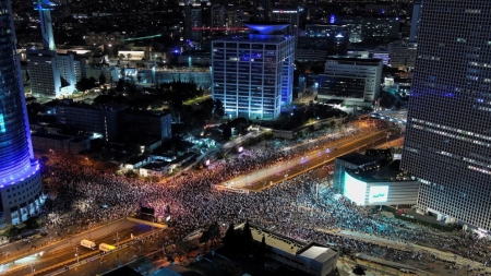 تظاهر حشد من الإسرائيليين مجددا في تل أبيب مساء السبت؛ للاحتجاج على التعديلات القضائية الذي تريد حكومة بنيامين نتنياهو تطبيقه، ويعتبره المتظاهرون مناهضا للديمقراطية