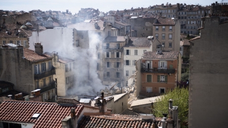 الأنقاض بعد انفجار أدى إلى انهيار مبنيين سكنيين في مدينة مرسيليا جنوبي فرنسا الأحد