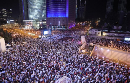 وكان عشرات الآلاف من الإسرائيليين، وصلوا مساء أمس إلى مقر الكنيست؛ تعبيرا عن احتجاجهم على حكومة نتنياهو بسبب القانون.