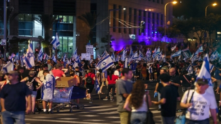 وتجمع آلاف المتظاهرين السبت، في تل أبيب، ولوّح بعضهم بالأعلام الإسرائيلية وهتفوا "ديمقراطية، ديمقراطية"، وفق ما أفادت وسائل إعلام إسرائيلية.