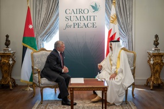 ولفت جلالته في اللقاء، الذي عقد على هامش قمة القاهرة للسلام التي تستضيفها مصر، إلى أولوية العمل مع المجتمع الدولي للضغط على إسرائيل لوقف العدوان فورا، والسماح بدخول المساعدات الإنسانية ورفع الحصار، وحماية المدنيين.