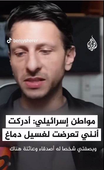 مدرب الصحة النفسية بينجي شيرر اليهودي الذي يملك جنسية إسرائيلية، يؤكد في مقطع فيديو نشره على "تيك توك" أنه تعرض لغسيل دماغ بخصوص ما يحصل في فلسطين، ويعبر عن معارضته للعدوان الذي يمارسه جيش الاحتلال على غزة.