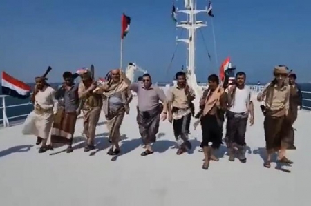 تداول نشطاء على مواقع التواصل مقطعا مصورا يظهر عددا من الأشخاص وهم يؤدون رقصة "البرعة اليمنية" على متن سفينة "غالاكسي ليدر"، التي سيطر عليها "أنصار الله" في اليمن.