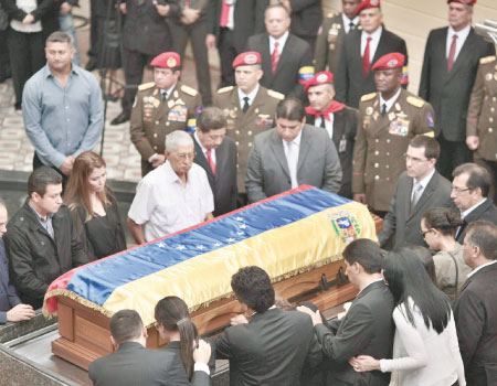 وبعد تسعة ايام على وفاته، نقل جثمان تشافيز