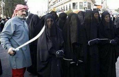 الصورة تظهر نساء وقد لبسن عباءات سوداء، وعلي وجوههن قماش شفاف تظهر منه وجوههن، بينما أياديهن مكبلة بحبل يربطهن بعضهن ببعض، ويقف بجوارهن شخص يحمل سيفا!!!.