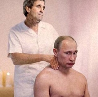 وقالت تقارير بأن كيري انتظر حتى استلقى بوتين على بطنه، على منضدة التدليك، في النادي الرياضي الذي يتردد عليه، ثم انسلّ بصمت إلى الحجرة بوصفه عامل تدليك.