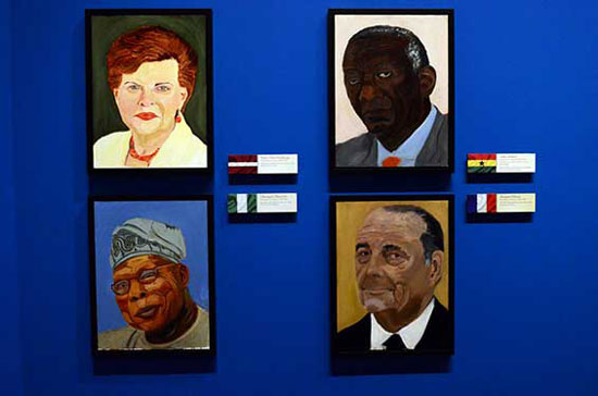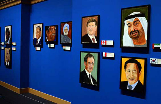 ويتضمن العمل الفني لوحات لرئيس الوزراء البريطاني السابق توني بلير والرئيس الروسي فلاديمير بوتين، والرئيس الأفغاني حامد كرزاي والدالاي لاما، والشيخ محمد بن زايد آل نهيان، وغيرهم.