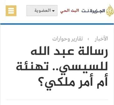 الراي  نيوز . في تقرير لقناة الجزيرة القطرية حمل عنوان "رسالة عبدالله للسيسي.. تهنئة أم أمر ملكي؟"، استدعت فيه الآراء حول البرقية التي أرسلها ملك السعودية لرئيس مصر الجديد.