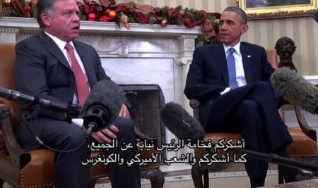 عقد جلالة الملك والرئيس الأمريكي باراك اوباما مؤتمرا صحفيا  عقب لقاء بينهما دام قرابة الساعة في البيت الأبيض ، تناولا فيه ابرز القضايا التي تهم المنطقة وابرزها الحرب ضد داعش والقضية الفلسطينية والملفات الاقتصادية .