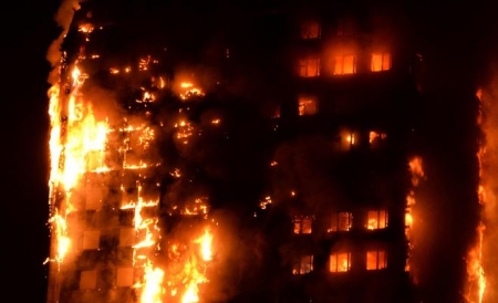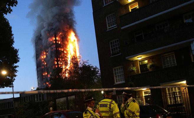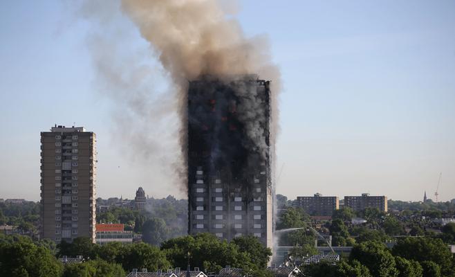 وشوهدت قطع كبيرة من الحطام تتساقط من برج غرينفيل تاور، المبنى الذي يعود بناؤه لسبيعينيات القرن الماضي في المنطقة التي تسكنها طبقة عمال شمال حي كنسينغتون، على مسافة قريبة من منطقة نوتينغ هيل الراقية.