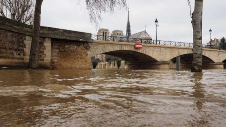 وغمرت المياه طرق السير على جانبي النهر في وقت سابق من هذا الأسبوع وزاد منسوب المياه لمستوى مرتفع جدا حال دون مرور المراكب النهرية أسفل الجسور القديمة المحيطة بكاتدرائية نوتردام.